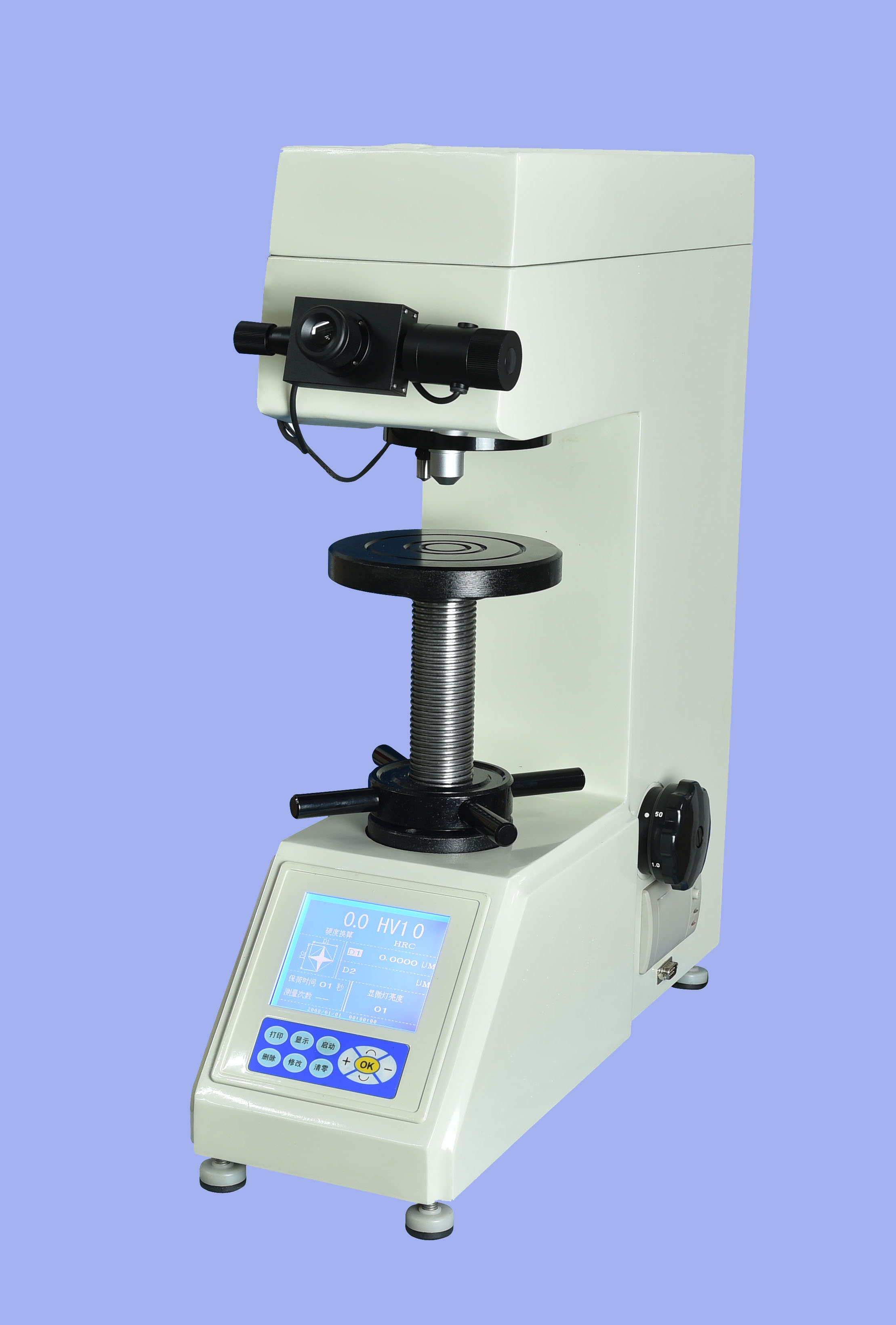 該機采用計算機軟件編程,光學測量系統。通過軟鍵輸入,可選擇不同的壓頭和力值測量、能調節測量光源的強弱,能選擇保荷時間,在LCD顯示屏上能顯示壓頭直徑、試驗力,測量范圍、屏幕直接讀出硬度值,簡便了查表的繁瑣。使用方便,由于采用旋轉編碼器測量精度更高。